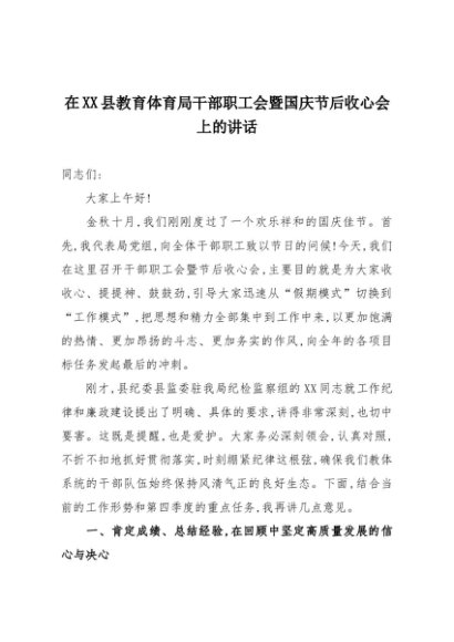 【七哥公文】2025年:在XX县教育体育局干部职工会暨国庆节后收心会上的讲话+更多免费公文+VX:QiGeGongWen2024