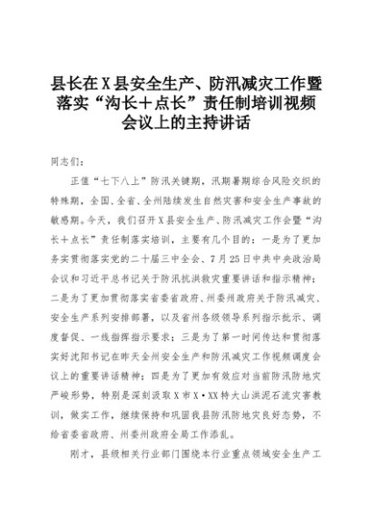 【七哥公文】2025年:县长在X县安全生产、防汛减灾工作暨落实“沟长+点长”责任制培训视频会议上的主持讲话+更多免费公文+VX:QiGeGongWen2024