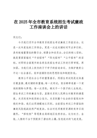 【七哥公文】2025年:在2025年全市教育系统招生考试廉政工作座谈会上的讲话+更多免费公文+VX:QiGeGongWen2024