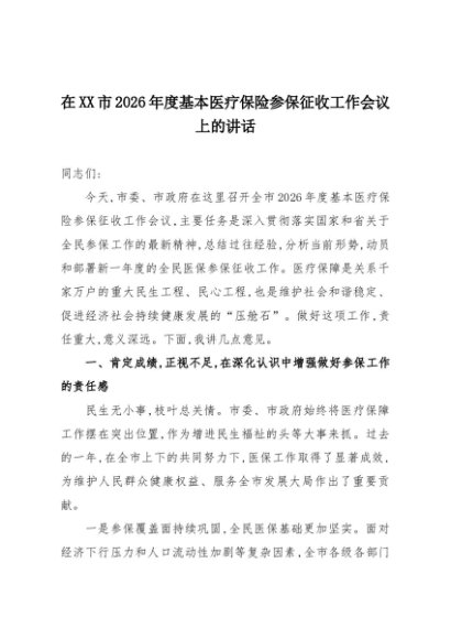 【七哥公文】2025年:在XX市2026年度基本医疗保险参保征收工作会议上的讲话+更多免费公文+VX:QiGeGongWen2024