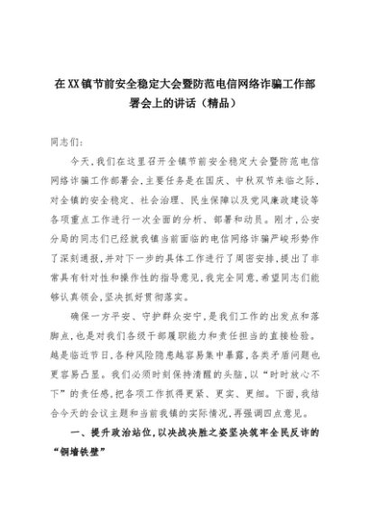 【七哥公文】2025年:在XX镇节前安全稳定大会暨防范电信网络诈骗工作部署会上的讲话(精品)+更多免费公文+VX:QiGeGongWen2024