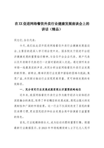 【七哥公文】2025年:在XX促进网络餐饮外卖行业健康发展座谈会上的讲话(精品)+更多免费公文+VX:QiGeGongWen2024