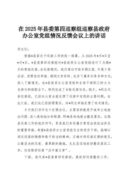 【七哥公文】2025年:在2025年县委第四巡察组巡察县政府办公室党组情况反馈会议上的讲话+更多免费公文+VX:QiGeGongWen2024