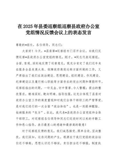 【七哥公文】2025年:在2025年县委巡察组巡察县政府办公室党组情况反馈会议上的表态发言+更多免费公文+VX:QiGeGongWen2024