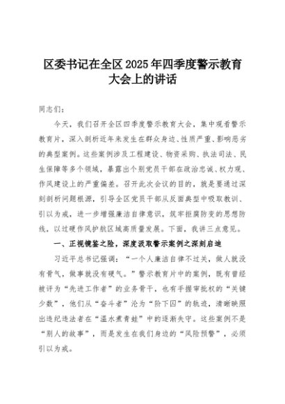 / 【七哥公文】2025年:区委书记在全区2025年四季度警示教育大会上的讲话+更多免费公文+VX:QiGeGongWen2024