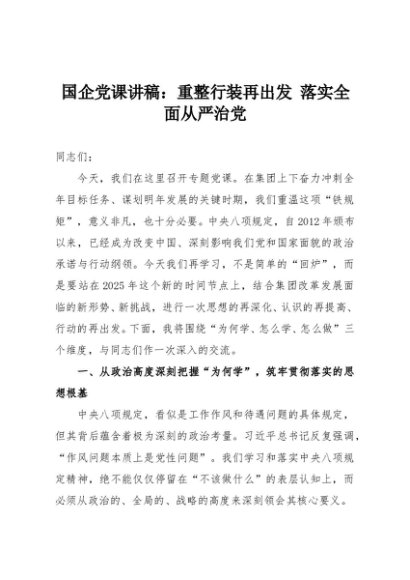 / 【七哥公文】2025年:国企党课讲稿:重整行装再出发 落实全面从严治党+更多免费公文+VX:QiGeGongWen2024