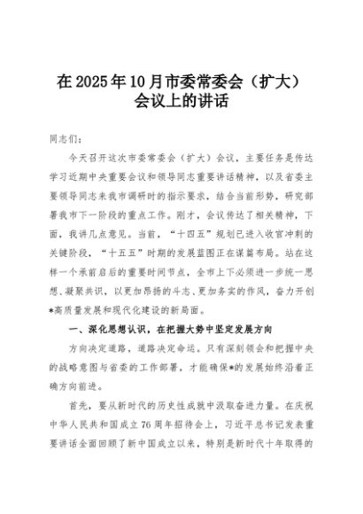 / 【七哥公文】2025年:在2025年10月市委常委会(扩大)会议上的讲话+更多免费公文+VX:QiGeGongWen2024