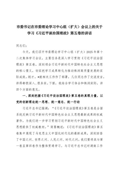 【七哥公文】2025年:市委书记在市委理论学习中心组(扩大)会议上的关于学习《习近平谈治国理政》第五卷的讲话+更多免费公文+VX:QiGeGongWen2024