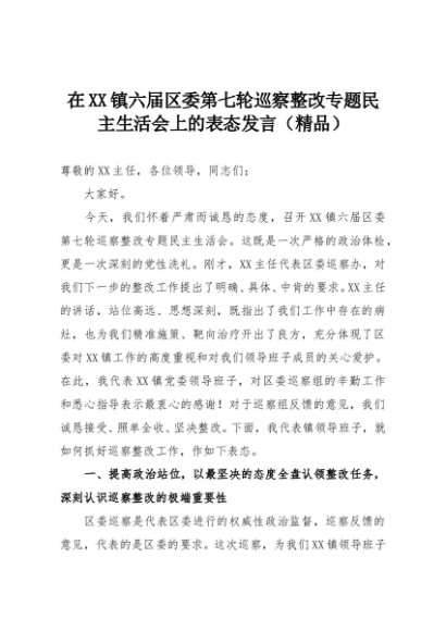 【七哥公文】2025年:在XX镇六届区委第七轮巡察整改专题民主生活会上的表态发言(精品)+更多免费公文+VX:QiGeGongWen2024