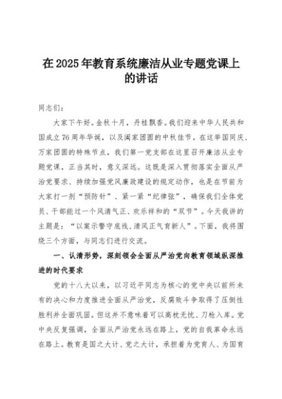 / 【七哥公文】2025年:在2025年教育系统廉洁从业专题党课上的讲话+更多免费公文+VX:QiGeGongWen2024
