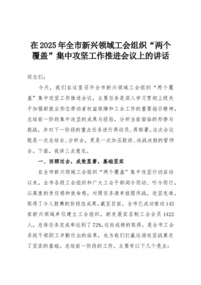 【七哥公文】2025年:在2025年全市新兴领域工会组织“两个覆盖”集中攻坚工作推进会议上的讲话+更多免费公文+VX:QiGeGongWen2024