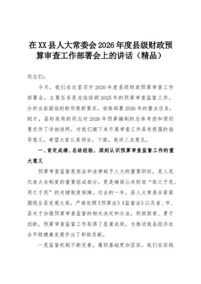 【七哥公文】2025年:在XX县人大常委会2026年度县级财政预算审查工作部署会上的讲话(精品)+更多免费公文+VX:QiGeGongWen2024