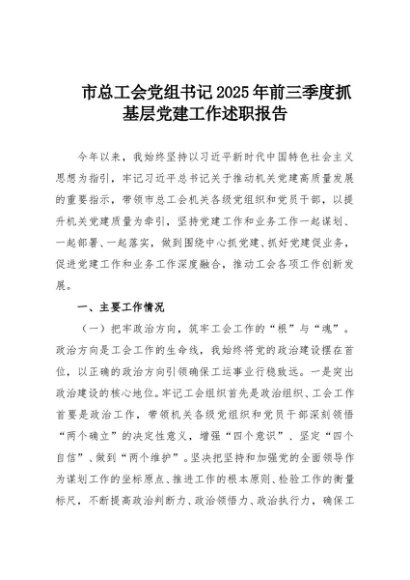 【七哥公文】2025年:市总工会党组书记2025年前三季度抓基层党建工作述职报告+更多免费公文+VX:QiGeGongWen2024