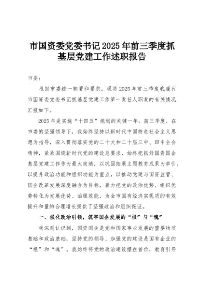 【七哥公文】2025年:市国资委党委书记2025年前三季度抓基层党建工作述职报告+更多免费公文+VX:QiGeGongWen2024