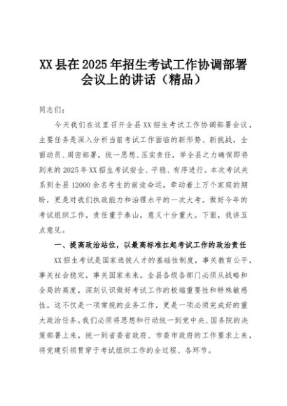 【七哥公文】2025年:XX县在2025年招生考试工作协调部署会议上的讲话(精品)+更多免费公文+VX:QiGeGongWen2024