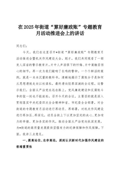 【七哥公文】2025年:在2025年街道“算好廉政账”专题教育月活动推进会上的讲话+更多免费公文+VX:QiGeGongWen2024