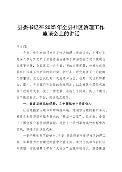 / 【七哥公文】2025年:县委书记在2025年全县社区治理工作座谈会上的讲话+更多免费公文+VX:QiGeGongWen2024