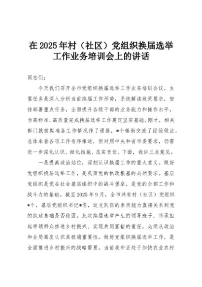 【七哥公文】2025年:在2025年村(社区)党组织换届选举工作业务培训会上的讲话+更多免费公文+VX:QiGeGongWen2024