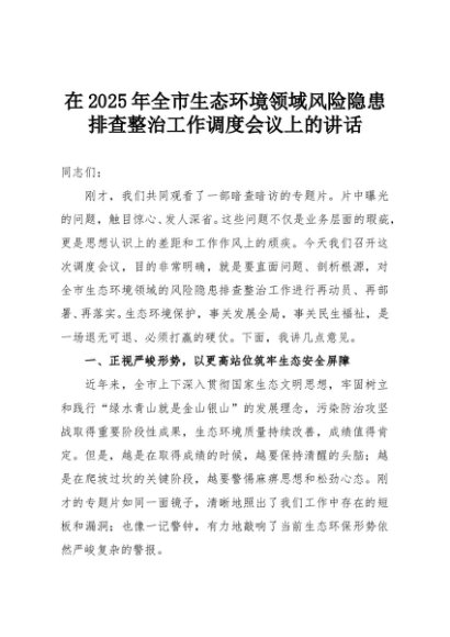 【七哥公文】2025年:在2025年全市生态环境领域风险隐患排查整治工作调度会议上的讲话+更多免费公文+VX:QiGeGongWen2024