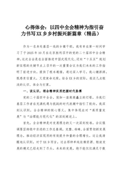 【七哥公文】2025年:心得体会:以四中全会精神为指引奋力书写XX乡乡村振兴新篇章(精品)+更多免费公文+VX:QiGeGongWen2024