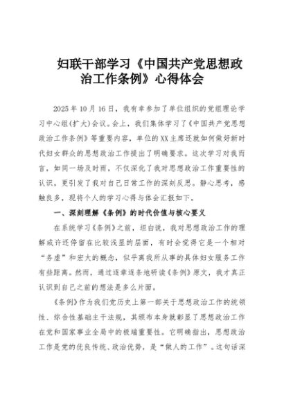 / 【七哥公文】2025年:妇联干部学习《中国共产党思想政治工作条例》心得体会+更多免费公文+VX:QiGeGongWen2024