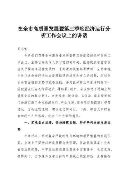 【七哥公文】2025年:在全市高质量发展暨第三季度经济运行分析工作会议上的讲话+更多免费公文+VX:QiGeGongWen2024
