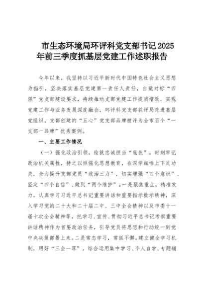 【七哥公文】2025年:市生态环境局环评科党支部书记2025年前三季度抓基层党建工作述职报告+更多免费公文+VX:QiGeGongWen2024