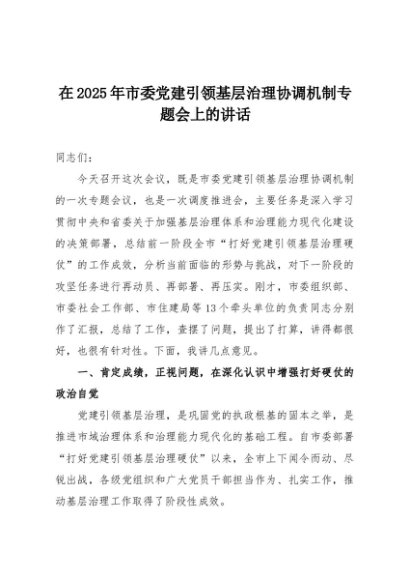 【七哥公文】2025年:在2025年市委党建引领基层治理协调机制专题会上的讲话+更多免费公文+VX:QiGeGongWen2024