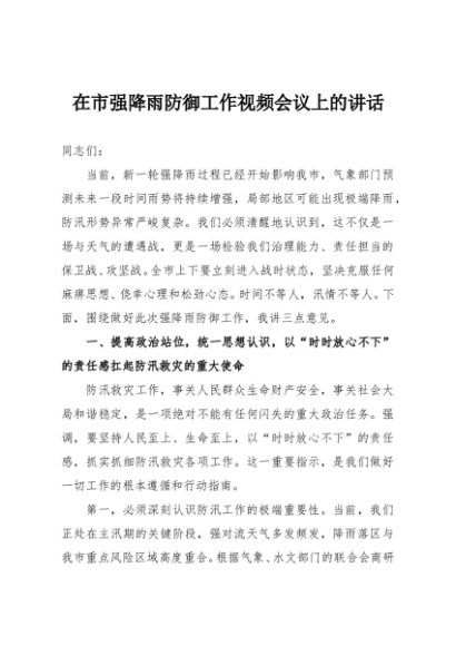 / 【七哥公文】2025年:在市强降雨防御工作视频会议上的讲话+更多免费公文+VX:QiGeGongWen2024