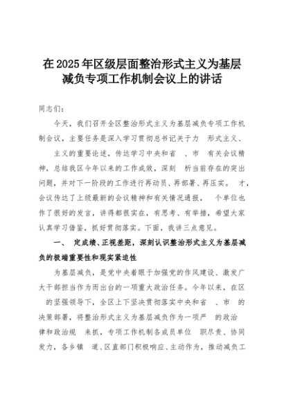 【七哥公文】2025年:在2025年区级层面整治形式主义为基层减负专项工作机制会议上的讲话+更多免费公文+VX:QiGeGongWen2024