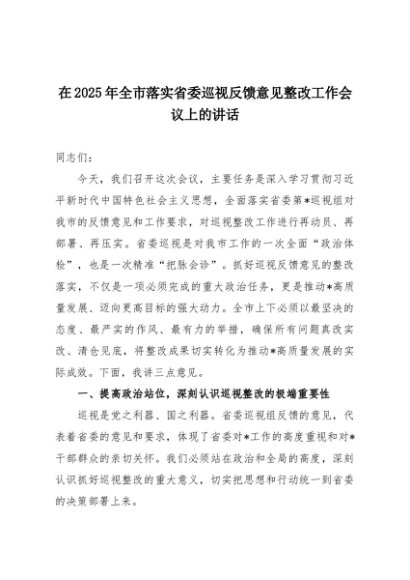 【七哥公文】2025年:在2025年全市落实省委巡视反馈意见整改工作会议上的讲话+更多免费公文+VX:QiGeGongWen2024