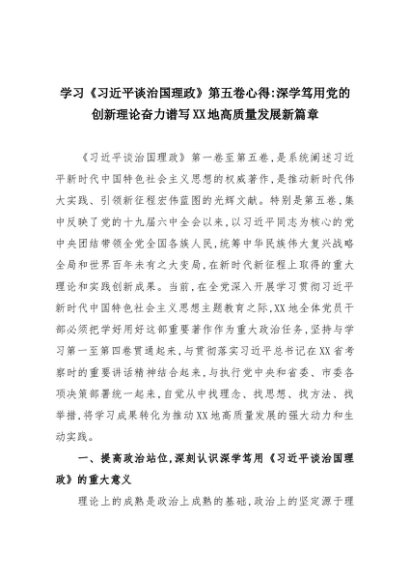 【七哥公文】2025年:学习《习近平谈治国理政》第五卷心得:深学笃用党的创新理论奋力谱写XX地高质量发展新篇章+更多免费公文+VX:QiGeGongWen2024