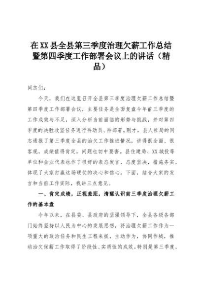 【七哥公文】2025年:在XX县全县第三季度治理欠薪工作总结暨第四季度工作部署会议上的讲话(精品)+更多免费公文+VX:QiGeGongWen2024