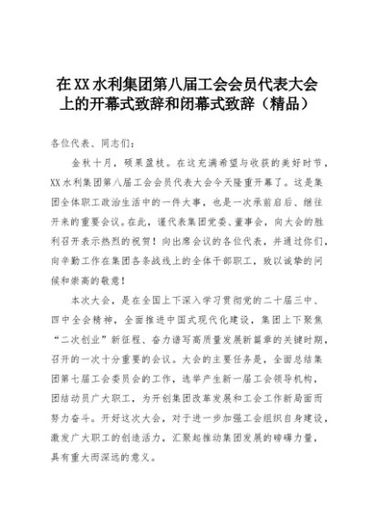 【七哥公文】2025年:在XX水利集团第八届工会会员代表大会上的开幕式致辞和闭幕式致辞(精品)+更多免费公文+VX:QiGeGongWen2024