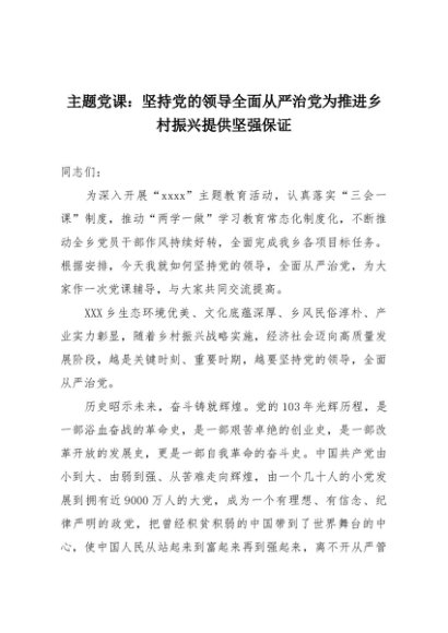 【七哥公文】2025年:主题党课:坚持党的领导全面从严治党为推进乡村振兴提供坚强保证+更多免费公文+VX:QiGeGongWen2024