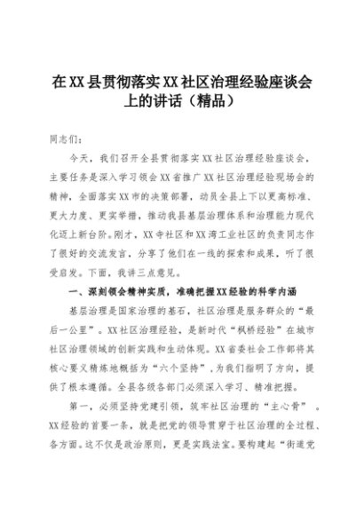 【七哥公文】2025年:在XX县贯彻落实XX社区治理经验座谈会上的讲话(精品)+更多免费公文+VX:QiGeGongWen2024