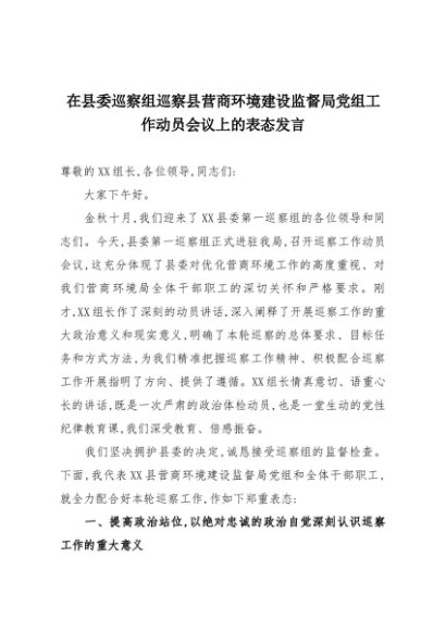 【七哥公文】2025年:在县委巡察组巡察县营商环境建设监督局党组工作动员会议上的表态发言+更多免费公文+VX:QiGeGongWen2024