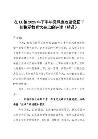 【七哥公文】2025年:在XX镇2025年下半年党风廉政建设暨干部警示教育大会上的讲话(精品)+更多免费公文+VX:QiGeGongWen2024