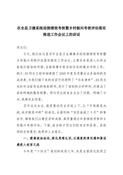 【七哥公文】2025年:在全县卫健系统迎接绩效考核暨乡村振兴考核评估落实推进工作会议上的讲话+更多免费公文+VX:QiGeGongWen2024