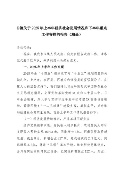 【七哥公文】2025年:X镇关于2025年上半年经济社会发展情况和下半年重点工作安排的报告(精品)+更多免费公文+VX:QiGeGongWen2024