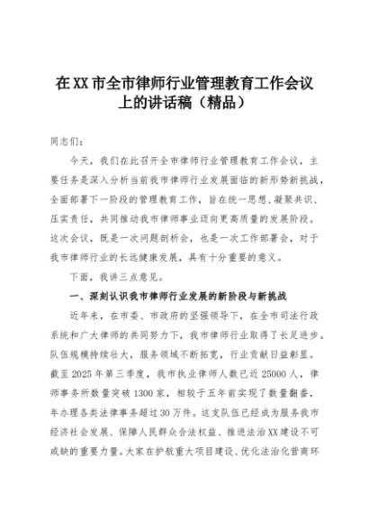 【七哥公文】2025年:在XX市全市律师行业管理教育工作会议上的讲话稿(精品)+更多免费公文+VX:QiGeGongWen2024