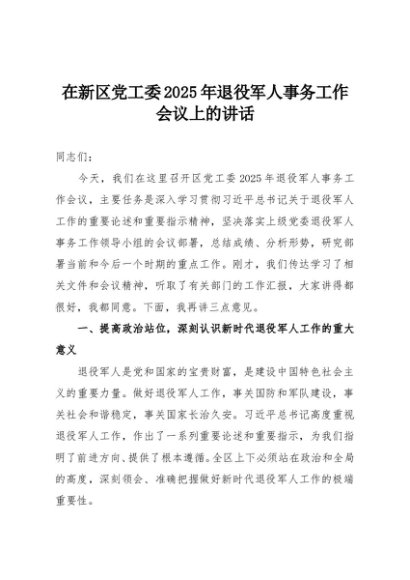 【七哥公文】2025年:在新区党工委2025年退役军人事务工作会议上的讲话+更多免费公文+VX:QiGeGongWen2024
