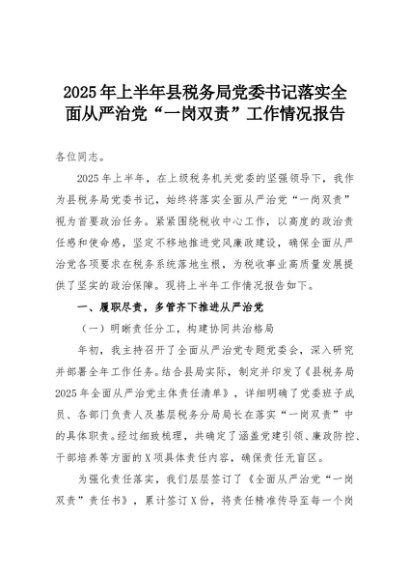 【七哥公文】2025年:2025年上半年县税务局党委书记落实全面从严治党“一岗双责”工作情况报告+更多免费公文+VX:QiGeGongWen2024