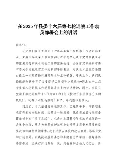 【七哥公文】2025年:在2025年县委十六届第七轮巡察工作动员部署会上的讲话+更多免费公文+VX:QiGeGongWen2024