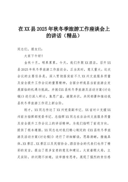 【七哥公文】2025年:在XX县2025年秋冬季旅游工作座谈会上的讲话(精品)+更多免费公文+VX:QiGeGongWen2024