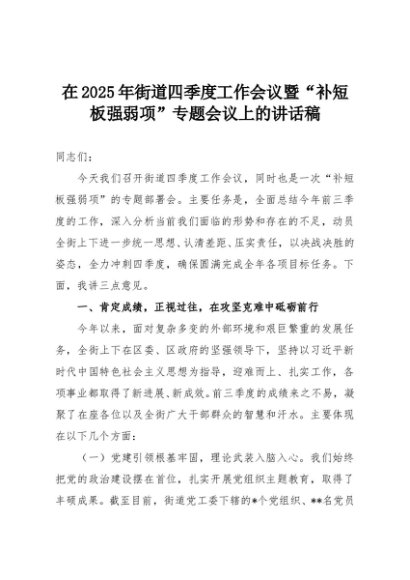 【七哥公文】2025年:在2025年街道四季度工作会议暨“补短板强弱项”专题会议上的讲话稿+更多免费公文+VX:QiGeGongWen2024