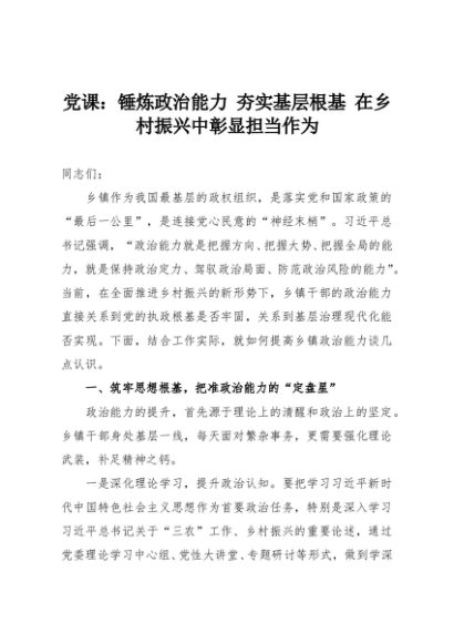 【七哥公文】2025年:党课:锤炼政治能力 夯实基层根基 在乡村振兴中彰显担当作为+更多免费公文+VX:QiGeGongWen2024