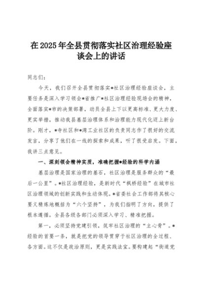 【七哥公文】2025年:在2025年全县贯彻落实社区治理经验座谈会上的讲话+更多免费公文+VX:QiGeGongWen2024