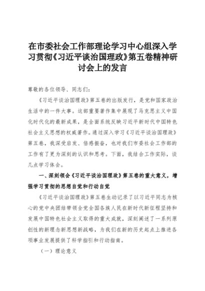 【七哥公文】2025年:在市委社会工作部理论学习中心组深入学习贯彻《习近平谈治国理政》第五卷精神研讨会上的发言+更多免费公文+VX:QiGeGongWen2024