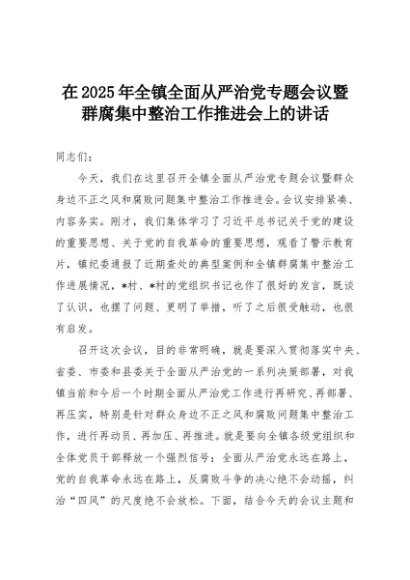 【七哥公文】2025年:在2025年全镇全面从严治党专题会议暨群腐集中整治工作推进会上的讲话+更多免费公文+VX:QiGeGongWen2024